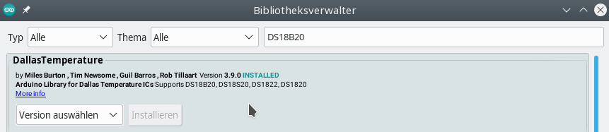 Um das Modul zusammen mit dem Arduino verwenden zu können, werden wir auf die DallasTemperature-Bibliothek zurückgreifen. Falls du es nicht bereits getan hast, musst du sie zuerst installieren. Öffne einfach den Bibliotheksverwalter unter Werkzeuge > Bibliotheken verwalten ... und suche nach dem Sensor. Wähl die DallasTemperature-Bibliothek aus und installiere sie. Es erscheint die Abfrage, ob die OneWire-Bibliothek gemeinsam mit der Dallas-Temperatur-Bibliothek installiert werden soll. Die OneWire-Bibliothek ist erforderlich, um die DallasTemperature-Bibliothek zu verwenden. Sie stellt die erforderlichen Funktionen für die Verwendung des 1-Wire-Busses zur Verfügung.
